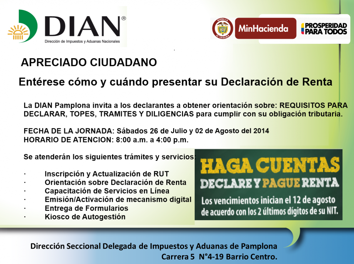 La DIAN seccional Pamplona invita a los nuevos declarantes del impuesto de renta los días Sábado 26 de Julio y 2 de Agosto de 2014 para obtener orientación para DECLARAR, TOPES, TRÁMITES Y DILIGENCIAS en cumplimiento de su obligación tributaria. VER EL VOLANTE INFORMATIVO. por otra parte, la DIAN informa que el miércoles 30 de Julio de 2014 se brindará una capacitación sobre el impuesto de renta 2013 y complementarios para personas naturales, evento que se realizará en el Auditorio Jorge Gaitán Duarte en la sede La Casona de la Universidad de Pamplona en el horario de 8:00 A.M. a 10:00 A.M.
