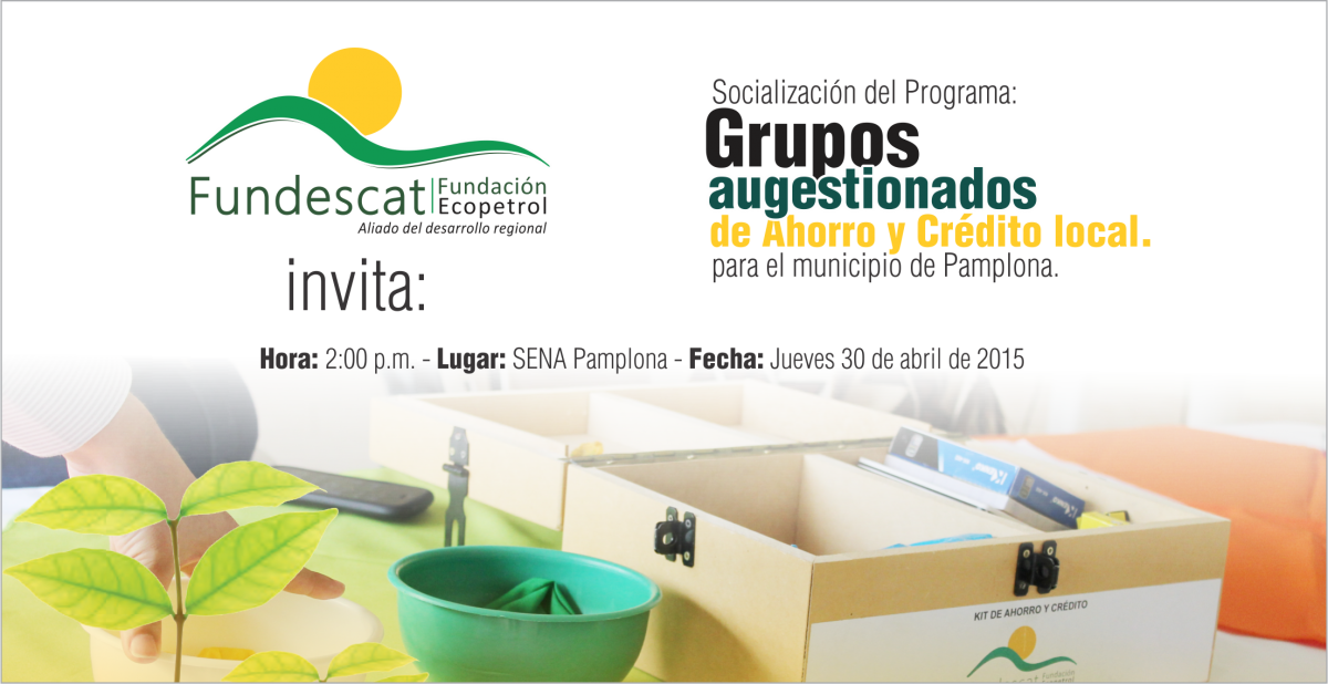 La Fundación Ecopetrol para el Desarrollo Regional, FUNDESCAT viene liderando el programa Socialización Grupos Autogestionados de Ahorro y Crédito local desde el 2012 con el apoyo de Ecopetrol, Bancoldex y la Asociación de Fundaciones Petroleras, AFP. la fundación ha abierto Sede en Pamplona y en Convenio con Alcaldía de Pamplona queremos socializar un Proyecto para trabajar con las comunidades en este municipio y los municipios vecinos denominado Grupos Autogestionados de Ahorro y Crédito Local, por lo que agradeceríamos mucho su apoyo con la invitación a las personas asociadas e inscritas en la Cámara de Comercio y un listado de las mismas, así mismo con su participación en la socialización del proyecto. Con el objetivo de implementar esta metodología en Pamplona, Fundescat, a través de Unidad Campus de Innovación Socioempresarial, realizará la socialización de este proyecto a las diferentes comunidades, juntas de acción comunal, comerciantes inscritos en la cámara de comercio y rectores de los colegios. La socialización se llevará a cabo el día 30 de abril en las instalaciones del Sena a las 2:00 p.m. En esta reunión se presentarán las generalidades y pormenores de cómo se va a organizar el programa en la región y cuál es el objetivo específico con esta iniciativa. ver invitación