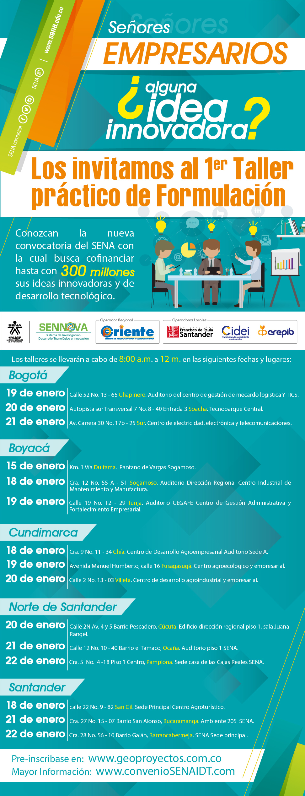 Con el fin de dar a conocer en detalle las características de la convocatoria e iniciar el proceso de formulación de los proyectos de las empresas, el Operador Regional CPC ORIENTE junto con su aliado, la UFPS, y los líderes SENNOVA por parte del SENA, van a realizar talleres en diferentes puntos de Nortes de Santander, así: