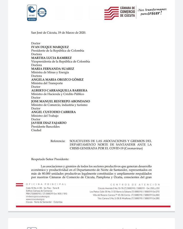 La Cámara de Comercio de Pamplona junto con la Cámara de Comercio de Cúcuta y Ocaña, en coordinación con el sector comercial y empresarial del departamento Norte de Santander #Solicitamos al Gobierno Nacional peticiones a corto plazo y que generan un inmediato alivio para nuestros empresarios y trabajadores.