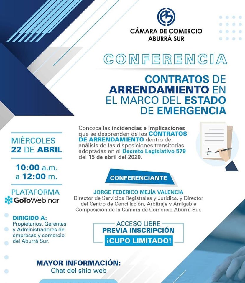 La Cámara de Comercio de Pamplona tiene el gusto de invitar a todos los comerciantes interesados a la conferencia de CONTRATOS DE ARRENDAMIENTOS EN EL MARCO DEL ESTADO DE EMERGENCIA.