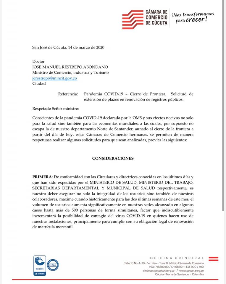La Cámara de Comercio de Pamplona, junto con la Cámara de Comercio de Cúcuta y Ocaña solicitaron la extensión de plazos para la