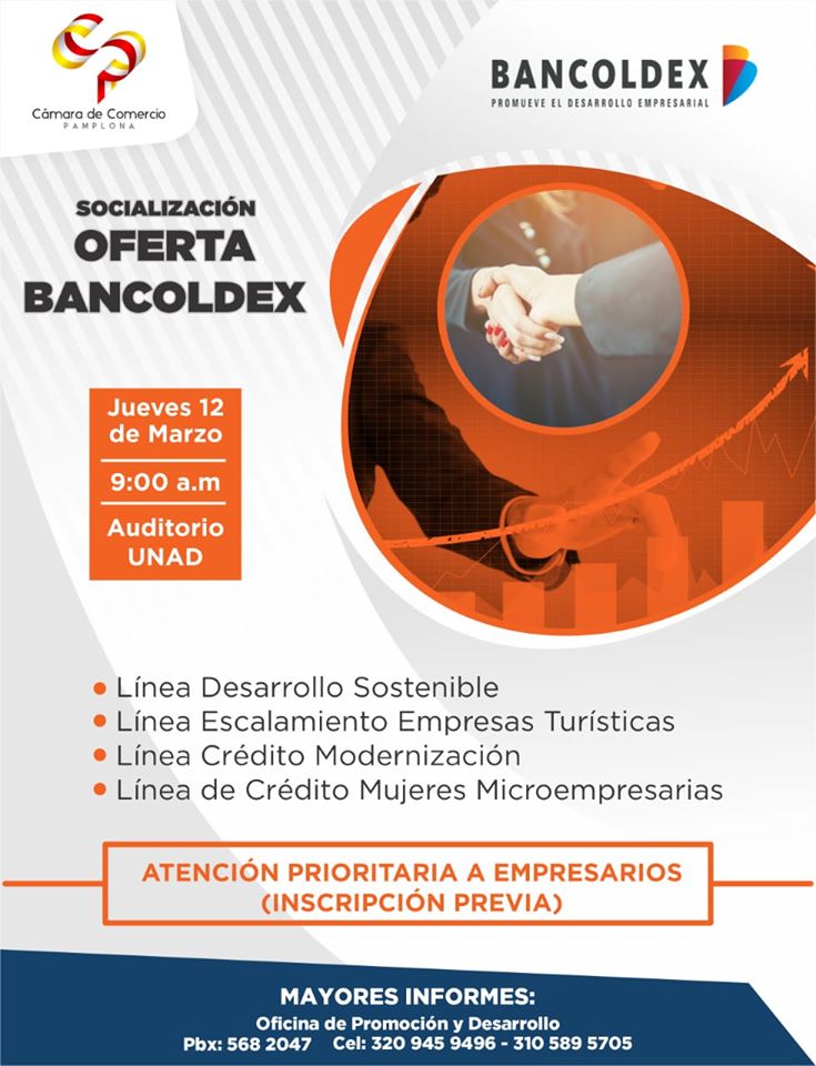 LA CÁMARA DE COMERCIO DE PAMPLONA INVITA A PARTICIPAR EN LA SOCIALIZACIÓN "OFERTA BANCÓLDEX".