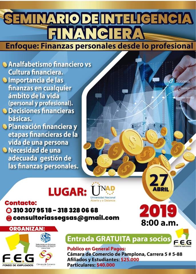 La Cámara De Comercio De Pamplona la Consultoría SSEG y el Fondo de Empleados de Guayabales-FEG, invitan a todos los empresarios, estudiantes y comunidad en general, al Seminario de Inteligencia Financiera el cual sera dado el 27 de abril a las 8 am en la UNAD.