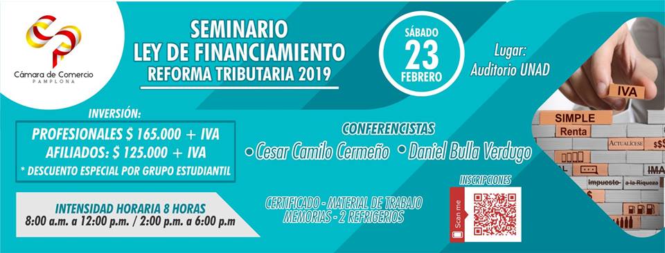 La Cámara de Comercio de Pamplona, tiene el gusto de invitar al Seminario: “Ley de Financiamiento Reforma Tributaria 2019” que se realizará el próximo sábado 23 de febrero en el auditorio de la UNAD Pamplona desde las 08:00AM – 12:00M y 2:00PM – 6:00PM