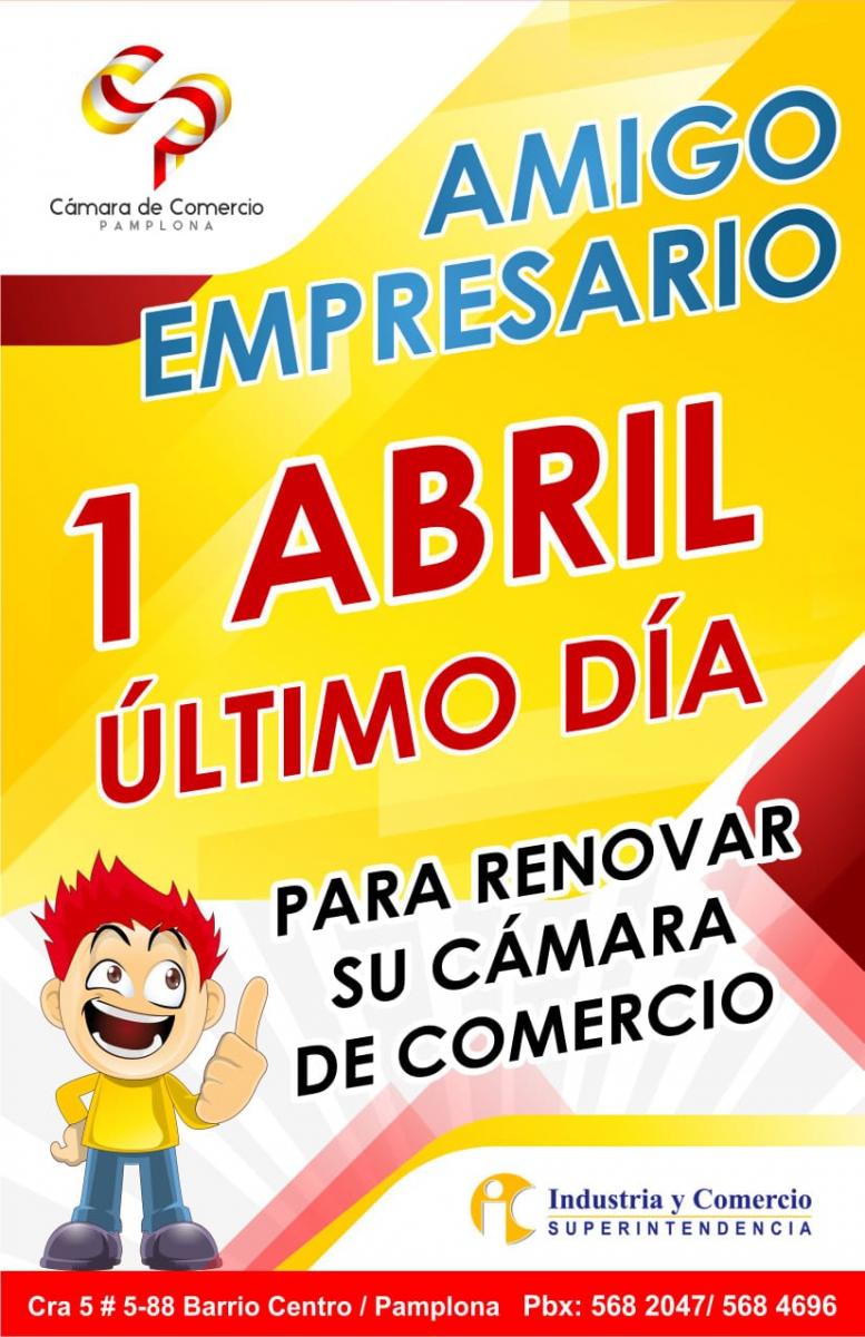 La Cámara de Comercio de Pamplona invita a la comunidad y renovar la Matricula Mercantil y la afiliación antes del 01 de ABRIL de 2019.