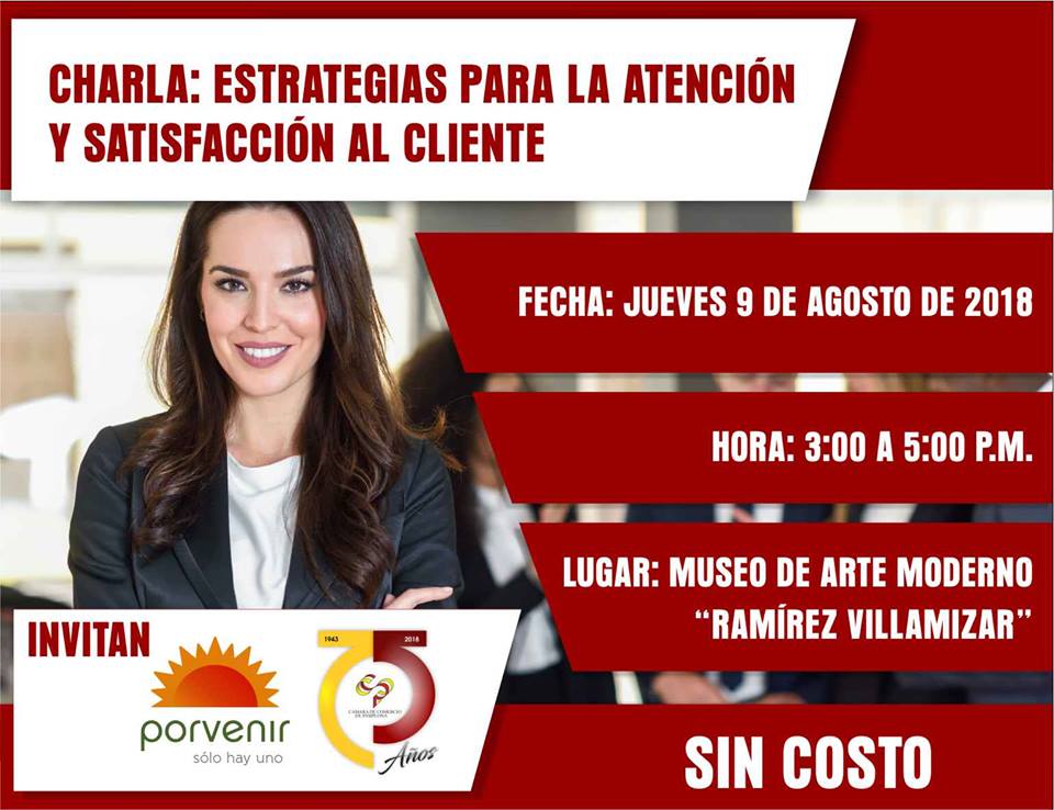 La Cámara de Comercio de Pamplona, tiene el gusto de invitar a la Charla “ESTRATEGIAS PARA LA ATENCIÓN Y SATISFACCIÓN AL CLIENTE” que se realizará el próximo jueves, 09 de agosto a partir de las 3:00 pm en el Museo de Arte Moderno Ramírez Villamizar ubicado en el Parque Principal Águeda Gallardo de Villamizar.