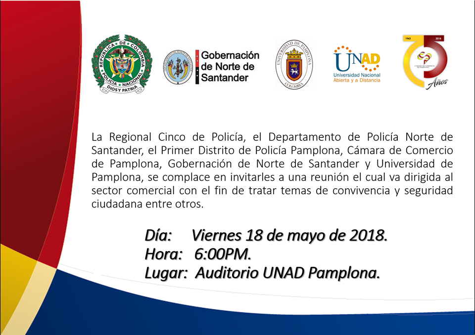 La Regional Cinco de Policía, el Departamento de Policía Norte de Santander, el Primer Distrito de Policía Pamplona, Cámara de Comercio de Pamplona, Gobernación de Norte de Santander y Universidad de Pamplona, se complace en invitarles a una reunión el cual va dirigida al sector