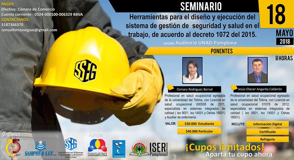 La Cámara de Comercio de Pamplona, continúa fortaleciendo al sector empresarial, en esta ocasión tiene el gusto de invitar a todos los comerciantes al Seminario en Herramientas para el Diseño y Ejecución del Sistema de Gestión de Seguridad y Salud en el Trabajo de acuerdo al decreto 1072 del 2015 que se realiz