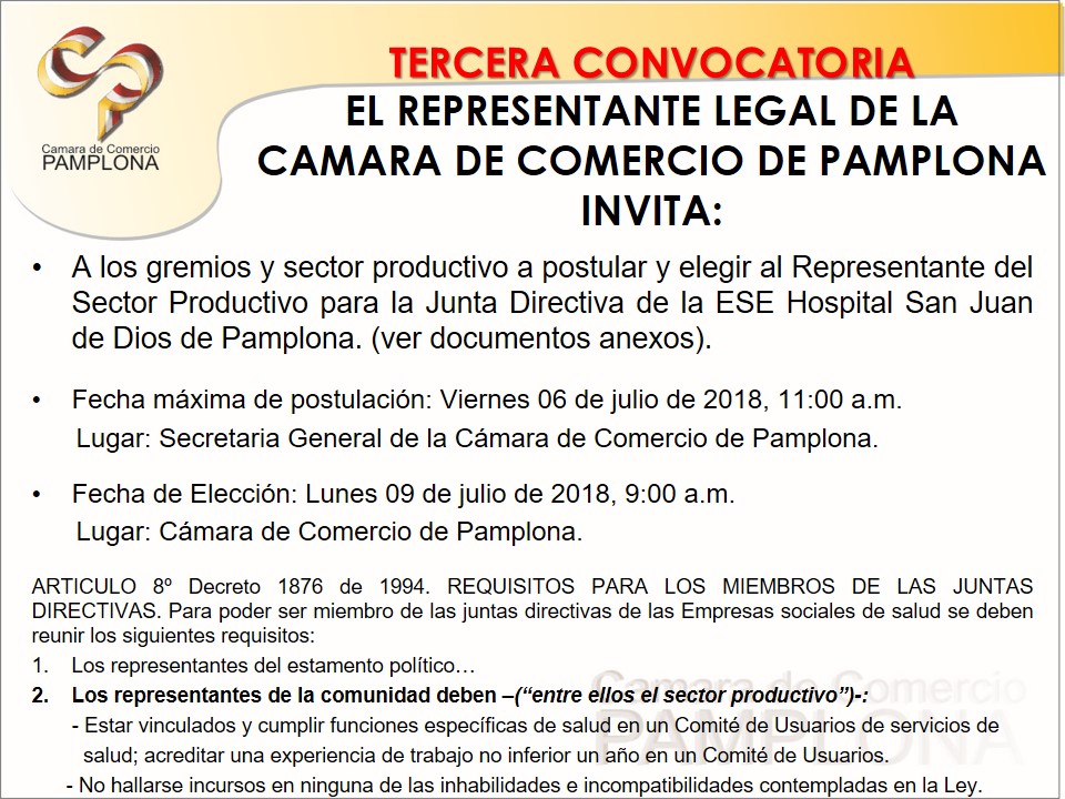 Se invita a los gremios y sector productivo de la Zona de Influencia de la ESE San Juan de Dios de Pamplona a postular y elegir al Representante del Sector Productivo para su Junta Directiva.