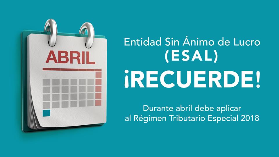 • Las ESAL creadas antes de 2016, que pretendan permanecer en el Régimen Tributario Especial para el año gravable 2018, tendrán hasta el 30 de abril para presentar la solicitud.