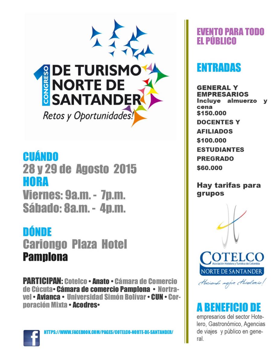 En la ciudad de Pamplona, durante dos días consecutivos se llevará a cabo el Primer Congreso de Turismo de Norte de Santander. El evento viene liderado por Cotelco Capítulo Norte de Santander, donde tendrán la participación ponentes nacionales, conocedores del tema y de la dinámica que éste sector viene mostrando a nivel nacional. Referencias del desarrollo de programas turísticos del eje cafetero, y otras más, harán parte de la programación que se lle