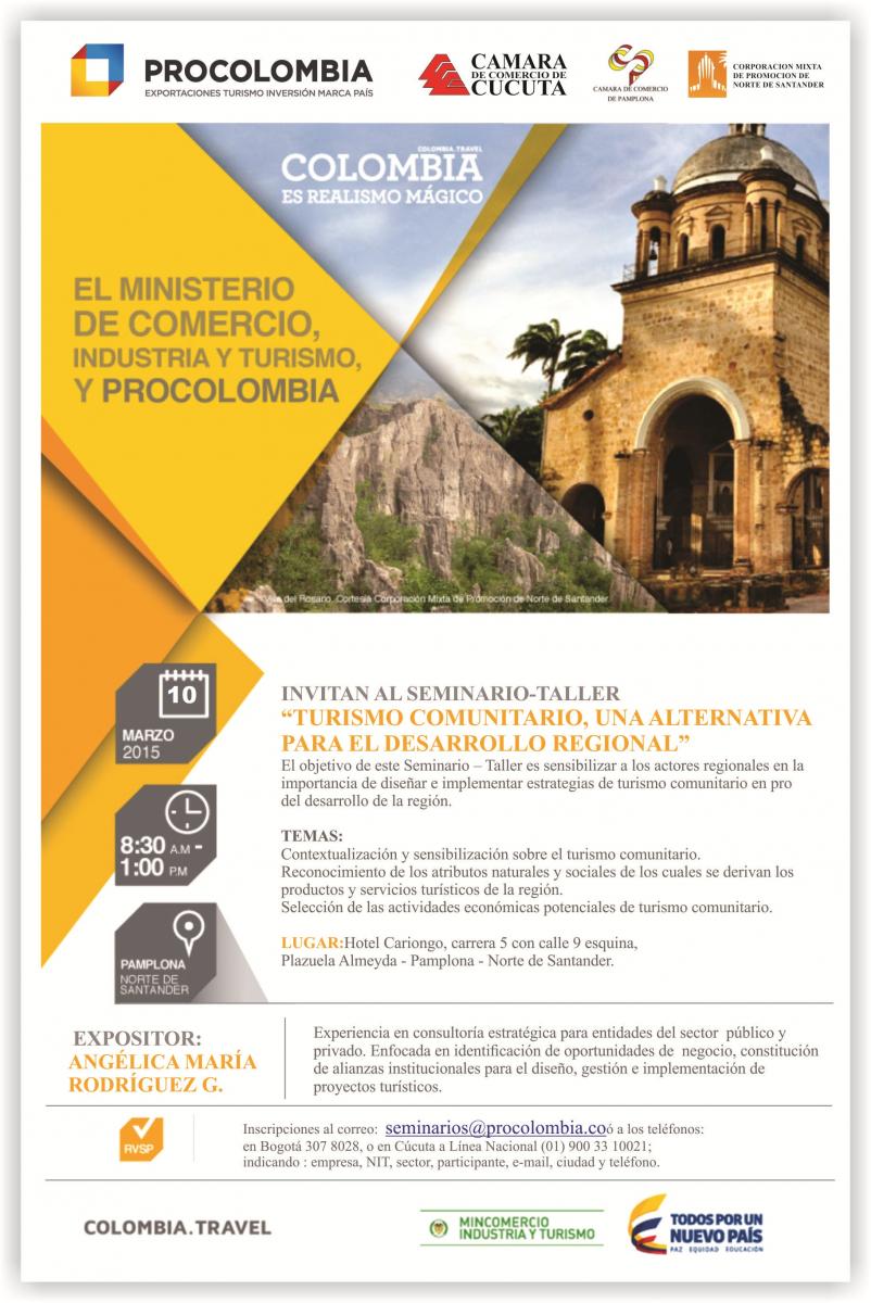 El pasado 10 de marzo, en las Instalaciones del Cariongo Plaza Hotel se desarrolló el Seminario Taller: "Turismo Comunitario, Una alternativa para el Desarrollo Regional, cuyo objetivo fue el de sensibilizar a los asistentes en la importancia de diseñar e implementar estrategias de tursimo comunitario en pro del desarrollo de la región, en nuestro caso de la Provincia de Pamplona.