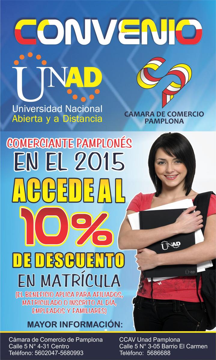 Mediante el convenio firmado entre UNAD y la Camara de Comercio de Pamplona, los comerciantes que se encuentren registrados en la Cámara de Comercio de Pamplona, podrán disfrutar del 10% de descuento en sus matriculas para adelantar sus estudios con centro de educativo, así mismo, presentando el certificado Electoral se incrementa un 10% adicional, recibiendo en total el 20% de descuento.