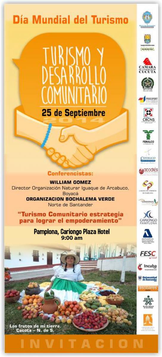 En el marco de la Celebración del Día Mundial del Turismo, el próximo jueves 25 de septiembre en la ciudad de Pamplona se desarrollará un conversatorio sobre "Turismo Comunitario: Estrategía para lograr el empoderamiento" donde se contará con las siguientes participaciones: ORGANIZACIÓN IGUAQUE DE ARCABUCO de BOYACA; ORGANIZACIÓN BOCHALEMA VERDE de NORTE DE SANTANDER; y a nivel local: RUTA DEL DURAZNO Y DEL AGUA. El evento se desarrol