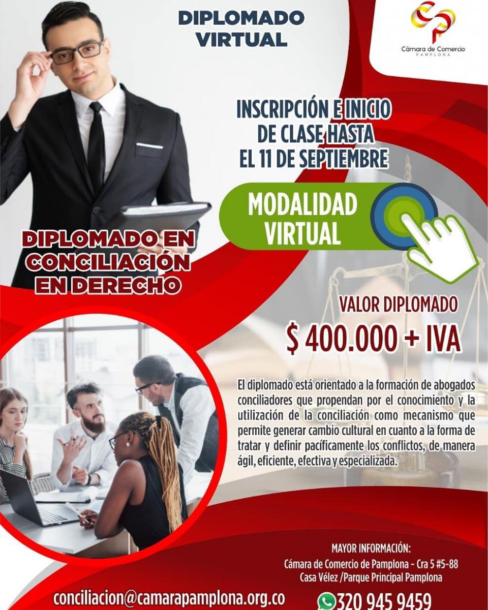 DIPLOMADO EN CONCILIACIÓN EN DERECHO La Cámara De Comercio De Pamplona oferta el diplomado virtual en Conciliación en Derecho.