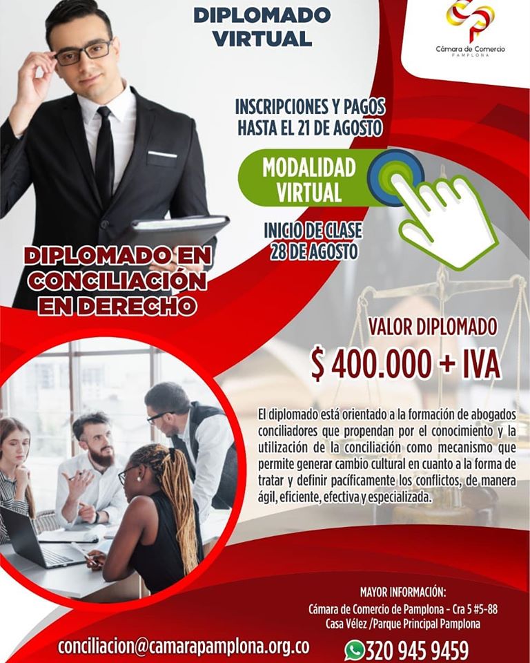La Cámara De Comercio De Pamplona oferta en la Modalidad Virtual el Diplomado en Conciliación En Derecho.